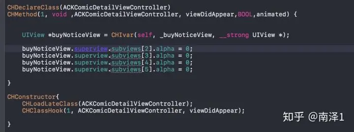 知道了如何能去除弹窗,就只剩下最后一步了,在monkey程序中实现刚才在cycript中的逻辑,可以在xxxDylib.m中修改,也可以在xxxDylib.xm中修改,区别是.m中用的是CaptainHook实现,而xm中用的Tweaks实现。这里我选择使用CaptainHook实现,代码如下: