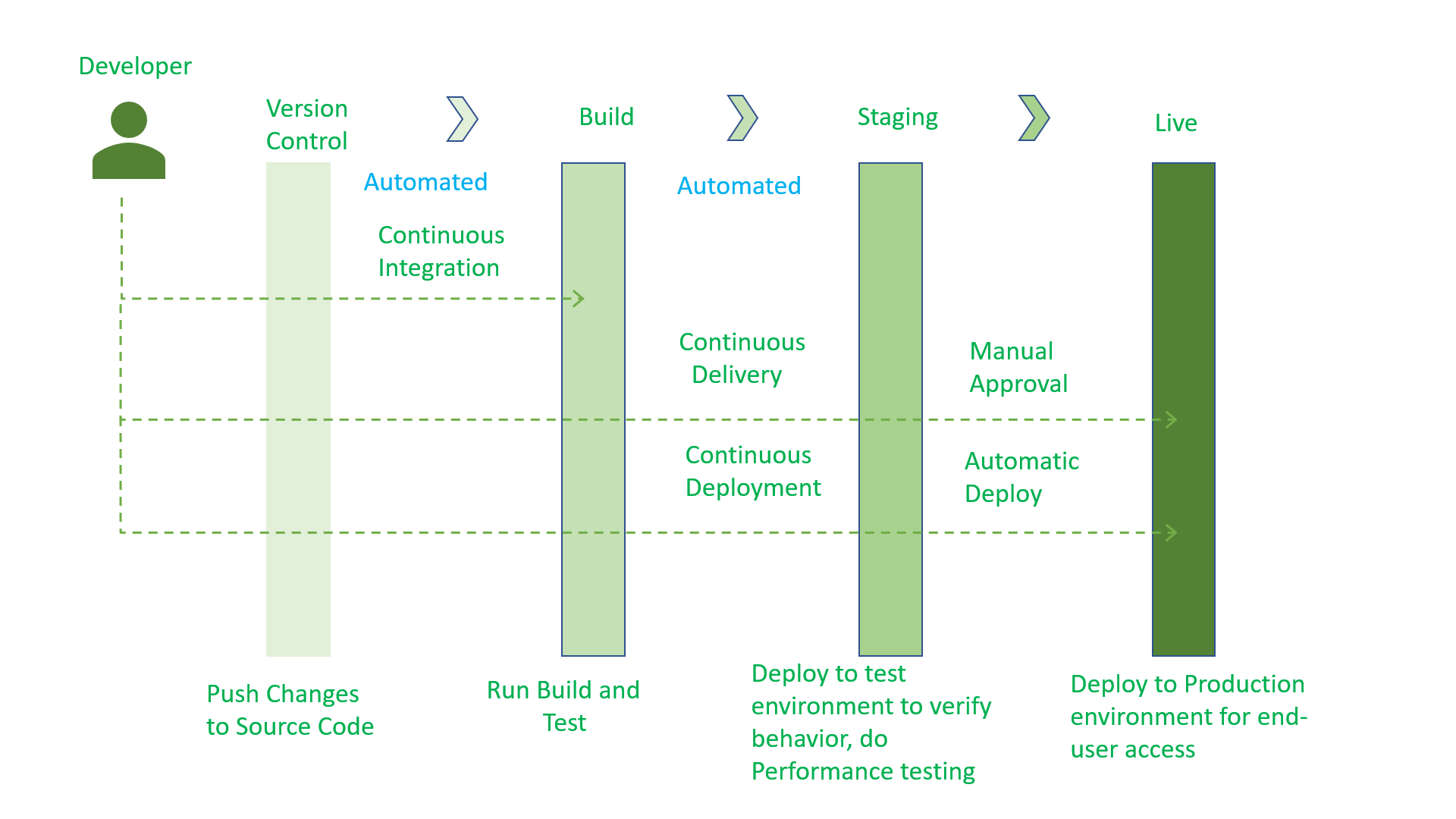 持续部署与持续交付非常相似。二者唯一区别是,在持续部署中,所有通过自动化测试阶段的代码提交都将自动发布到生产环境中。持续部署不需要在登台环境中进行任何手动测试,因为自动化测试将在发行版的所有阶段中执行。