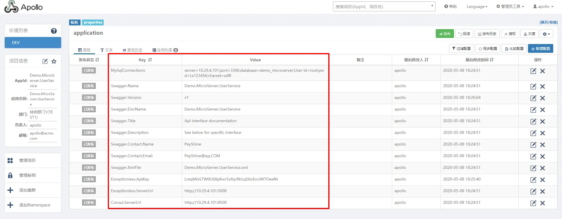 Apollo(阿波罗)是携程框架部门研发的分布式配置中心,能够集中化管理应用不同环境、不同集群的配置,配置修改后能够实时推送到应用端,并且具备规范的权限、流程治理等特性,适用于微服务配置管理场景。 由于各个项目配置都需要读取基础的配置信息,这边在内网的Centos(101)上部署了Apollo的环境,并为项目添加了一些基础配置信息,配置如图