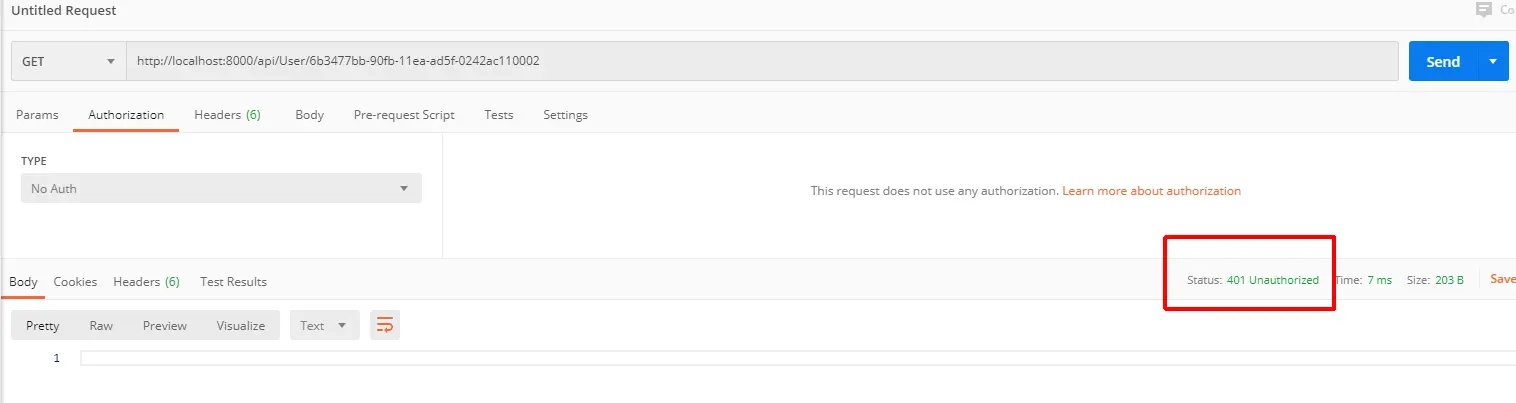 分类来完全几个东西:定义api资源,客户端访问资源范围,校验账户密码过程和数据返回格式 然后在api网关中项目中统一认证,这里需要说明下为什么要将IdentityServer4集成到网关当中而不是在每个服务实例单独去认证,想象一下,如果在一个大型项目中,不同的小组维护着不同的服务实例,势必每个小组都要在各自的代码中完成一套认证逻辑,确实没有必要, 而Ocelot天然对IdentityServer4进行了很好的集成,我们只需要在网关中统一添加认证代码即可,而各个微服务实例只需要关心各自的业务逻辑代码即可。 这个也列举一下使用过程,在客户端没有token时通过网关对api资源进行访问,可以看到如图的返回状态码:401