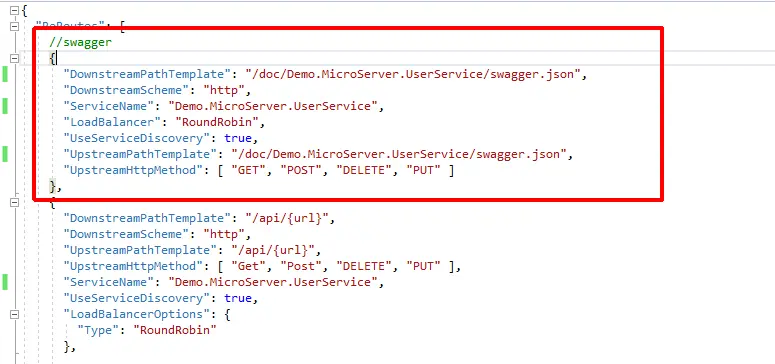 Ocelot是一个.NET API网关,它提供了路由,请求聚合,服务发现、鉴权、限流熔断、负载均衡器等一系列强大的功能,而这些功能只需要在配置文件中完成即可使用. 比如上面的swagger,我们在三个服务实例的端口打开都可以看到api相关文档信息,但是我们能否在api网关中直接集成呢,答案是肯定的,这依赖于ocelot强大的路由功能,如图,简单的几行配置,我们便将swagger配置到了网关当中
