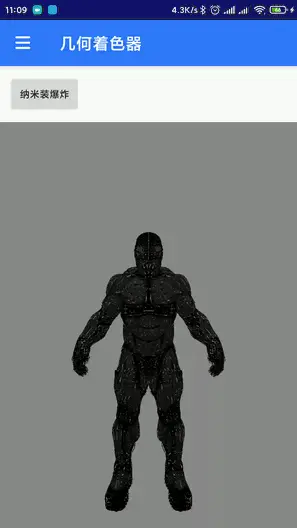 找出我们之前的模型加载中加载纳米装的代码,传入顶点和纹理,运行代码即看到如下的效果,因为图片被压缩过效果不太好,可以下载源码来查看。