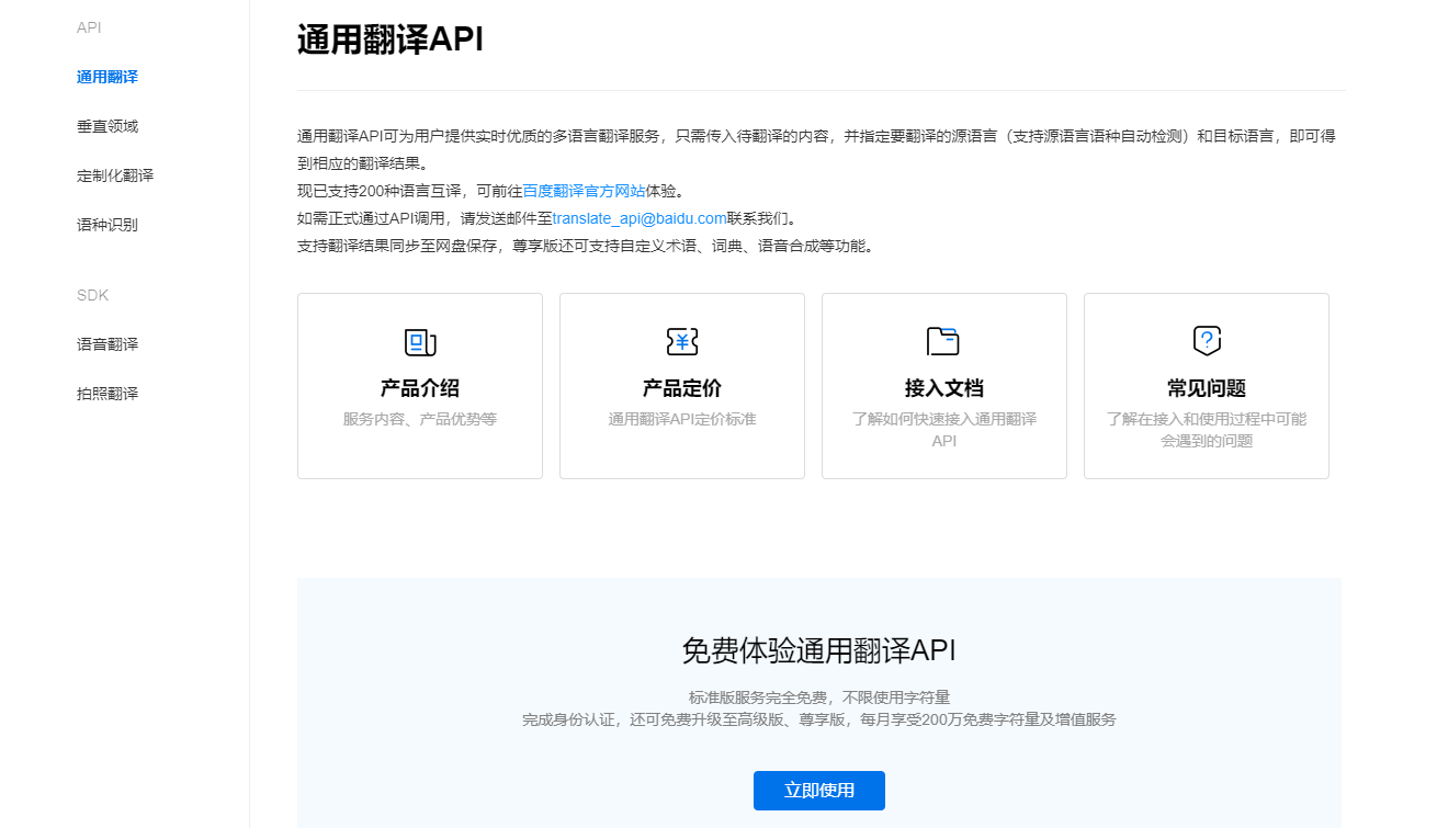 在官网进行登录过之后,点击产品服务,通用翻译 API, 点击立即使用,一般使用标准版就足够