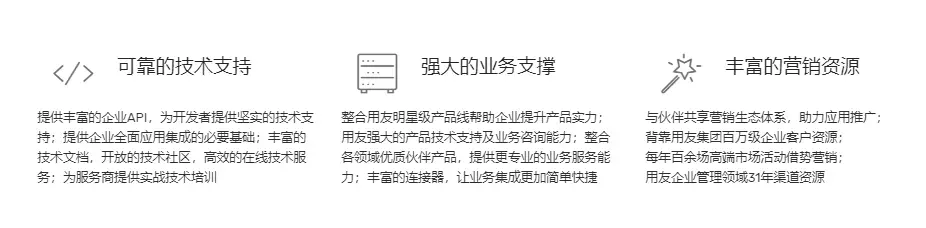 背靠用友百万客户,聚焦企业服务领域,汇聚优质平台伙伴,打通新技术及应用、企业与伙伴、伙伴与伙伴、产品服务与销售机会之间的壁垒,为客户提供强大的业务、技术、销售和营销资源。基于用友大量的企业用户资源及强大的开放连接能力,为企业应用开发者提供聚合用友多个产品级平台的入口。有助于企业产品推广,增加应用的流量、拓展新用户,获得收益。企业通过用友云开放平台,可将内部的信息系统延伸、整合到统一的移动入口及WEB端入口,快速帮助企业实现信息移动化,向企业用户提供更友好、更方便的企业服务,实现数据共享和生态伙伴融合。