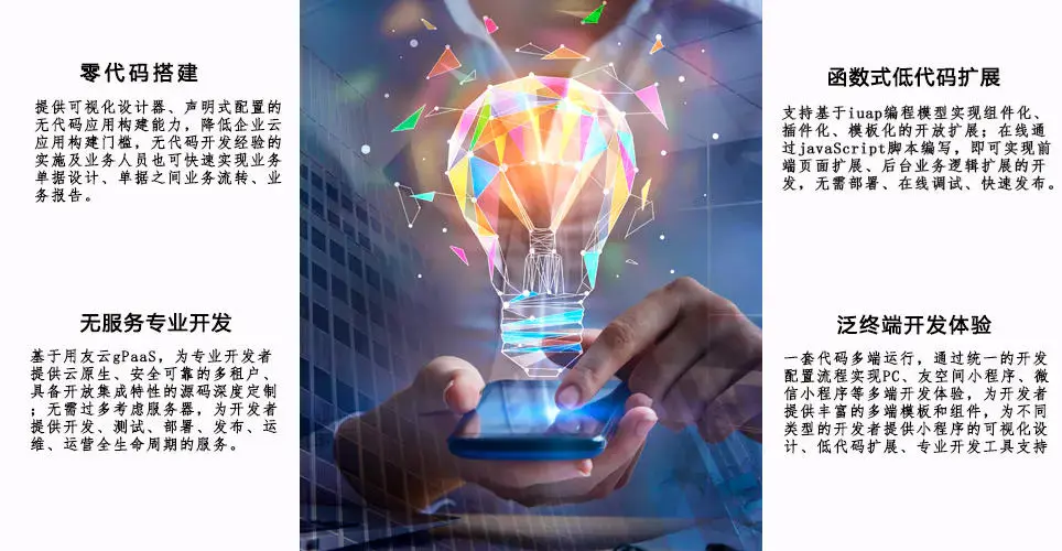 以用户、客户为中心,基于强大易用的YonBuilder构建能力,聚焦企业云服务领域,汇聚优质伙伴,提供可信任的、一站式的企业数字化生态服务。打通技术与应用之间的壁垒,赋能伙伴成长,共筑数智企业服务新生态:“快速实现商业应用创新,共生共赢共荣“。