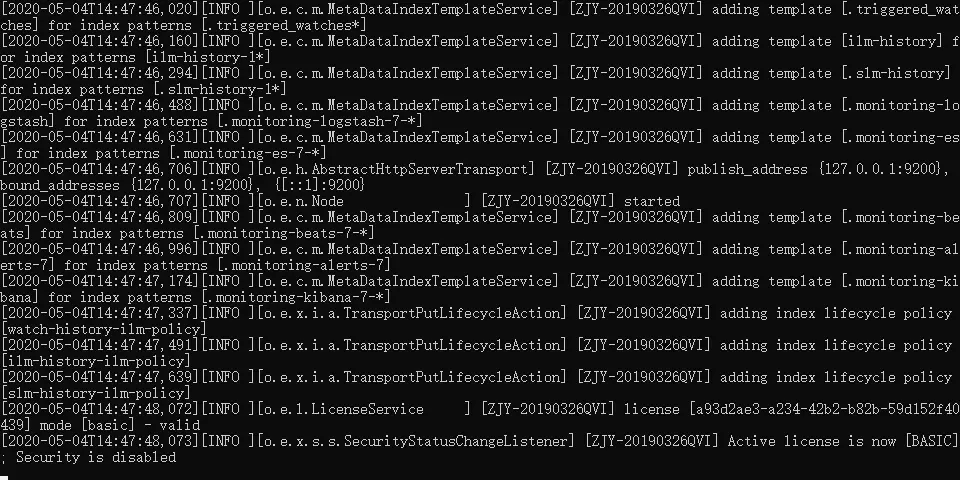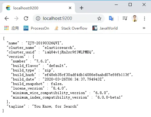 输出的日志信息有点多,不用细看,注意看到有“started”的字样就表明启动成功了。为了进一步确认 Elasticsearch 有没有启动成功,可以在浏览器的地址栏里输入 http://localhost:9200 进行查看(9200 是 Elasticsearch 的默认端口号)。