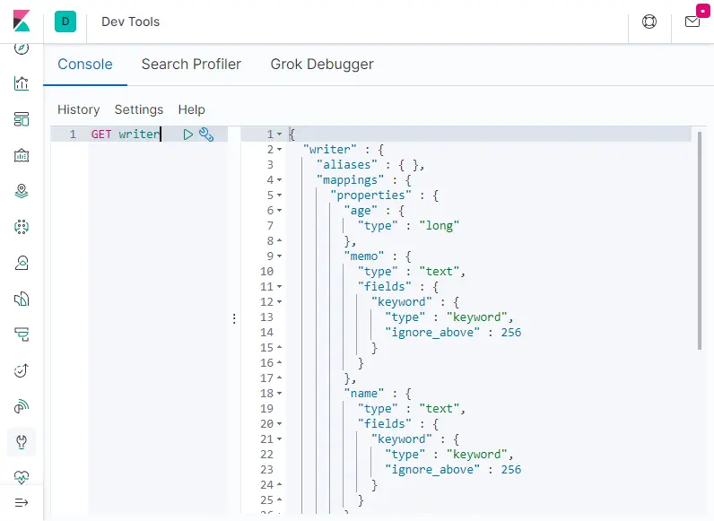 也可以通过 Kibana 的 Dev Tools 面板查看“writer”索引,结果如下图所示。