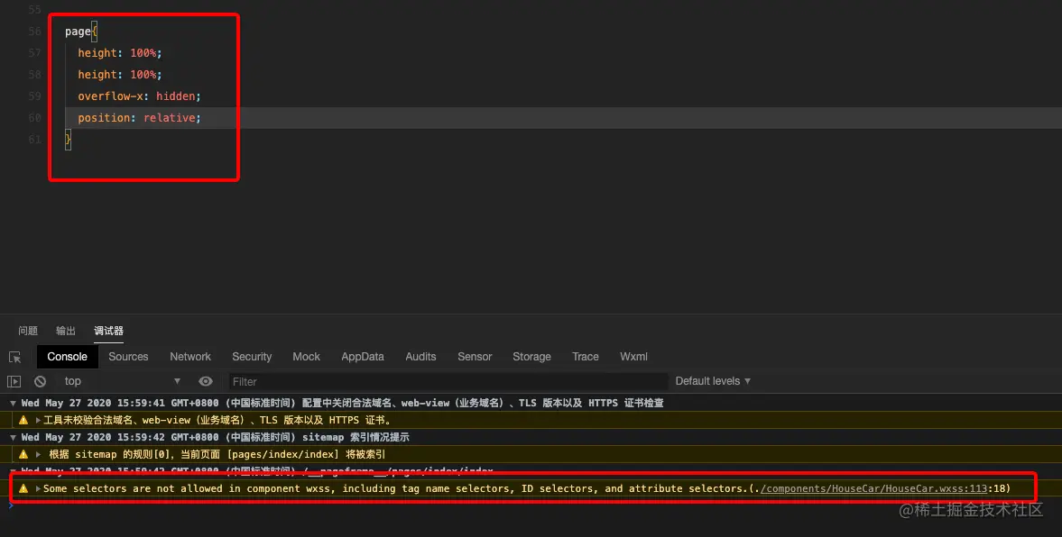 PS.注意微信小程序明确表示 css选择器不支持id 标签选择器。测试虽然能警告,但是还是能解析的。。。但是还是尽量别用了。