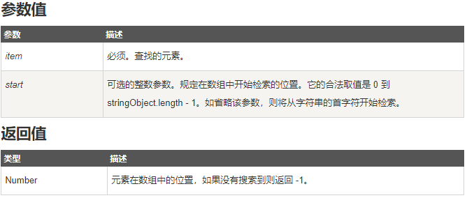 console.log(index2); // 3作用:该方法将从头到尾地检索数组,看它是否含有对应的元素。开始检索的位置在数组 start 处或数组的开头(没有指定 start 参数时)。如果找到一个 item,则返回 item 的第一次出现的位置。若没有找到则返回-1。