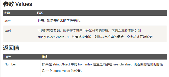 console.log(lastIndex2); // 1作用:该方法将从尾到头地检索数组中指定元素 item。开始检索的位置在数组的 start 处或数组的结尾(没有指定 start 参数时)。如果找到一个 item,则返回 item 从尾向前检索第一个次出现在数组的位置。如果在数组中没找到指定元素则返回 -1。