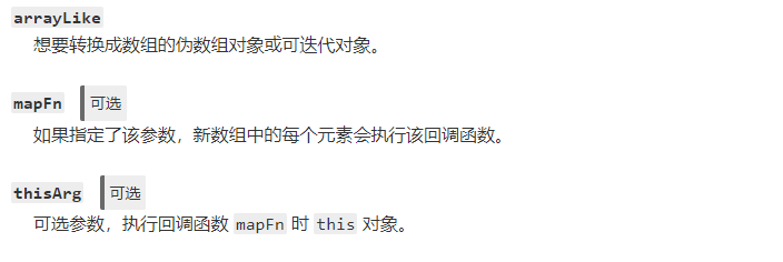 语法:Array.from(arrayLike, mapFn, thisArg)