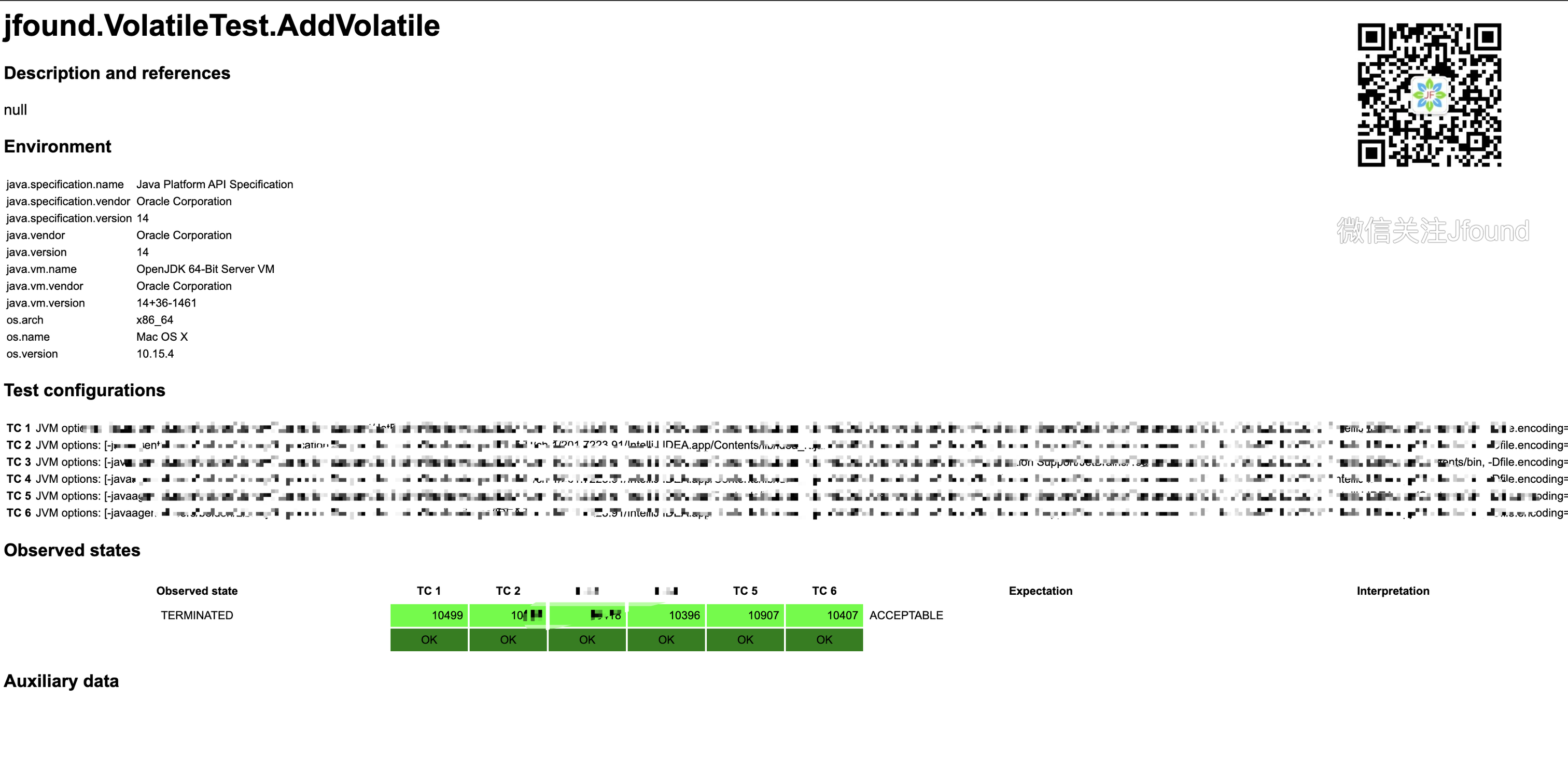 其中 id 接收结果,如上面的 TERMINATED 、 STALE 就是结果,id 还支持正则表达式;expect 是期望处理结果,类型为 org.openjdk.jcstress.annotationsExpect ,有 ACCEPTABLE、ACCEPTABLE_INTERESTING 、FORBIDDEN、UNKNOWN 四种类型,ACCEPTABLE 表示接受当前结果,ACCEPTABLE 结果不一定会存在;ACCEPTABLE_INTERESTING 和 ACCEPTABLE 差不多,唯一不一样的是,这个结果会在生成的报告中高亮;FORBIDDEN 表示永远不应该出现的结果,若测试过程中有该结果,意味着测试失败; UNKNOWN 没有评分,不使用。