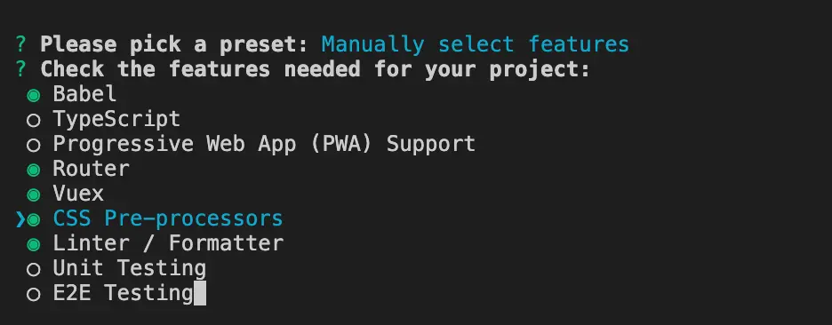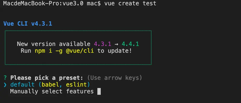- 选择一个文件夹,进入该文件夹终端, 运行vue create test