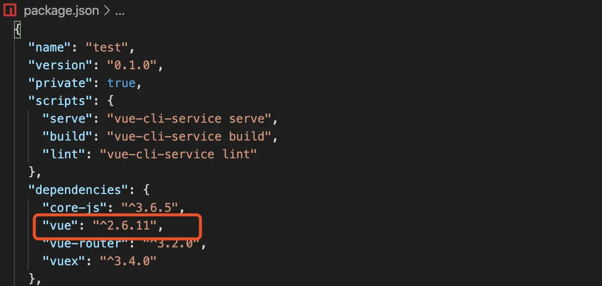 在package.json中查看当前所使用的vue的版本信息,此时还是2.x版本。