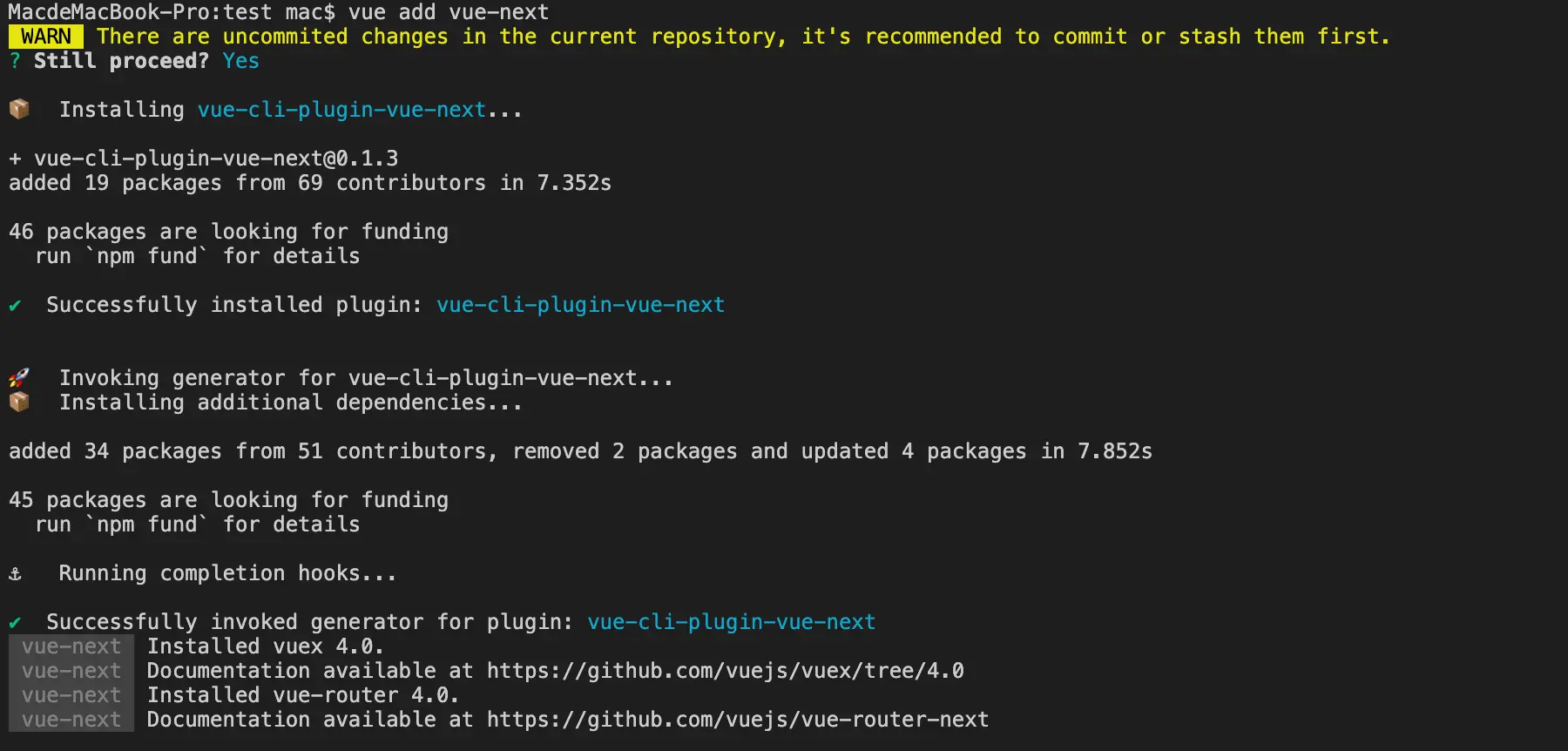 - 2.在控制台 cd test,进入项目目录下,vue add vue-next, 回车-> 输入Y -> 回车,此时由于我的脚手架版本还是4.0.1,安装vue-next失败,提示需要升级vue-cli(如果vue-cli已升级到4.3以上可跳过此处)。