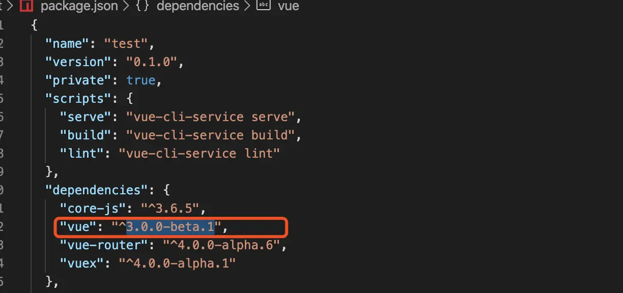 此时再打开package.json,我们就可以看到vue的版本已经升级为3.0.0-beta.1