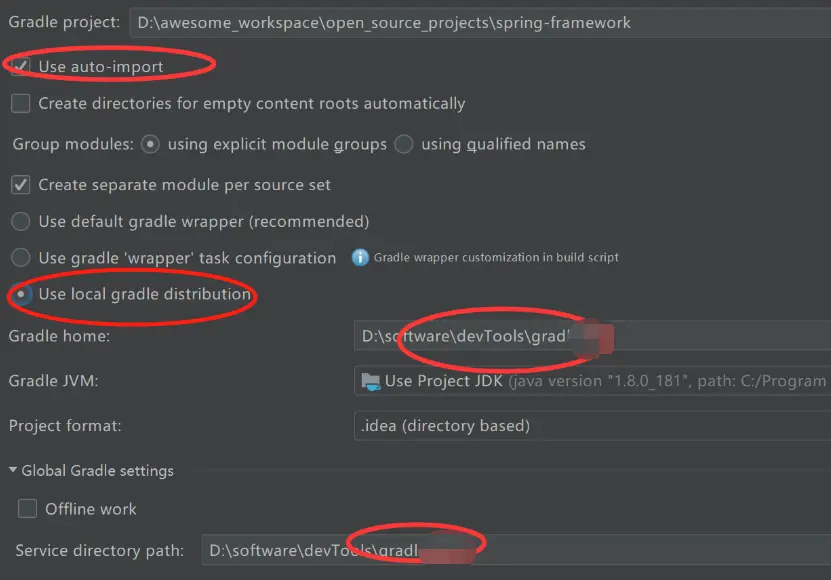 File -> New -> Project from Existing Sources -> 找到 Spring 项目路径 -> 选中 build.gradle,并配置gradle,如下图所示