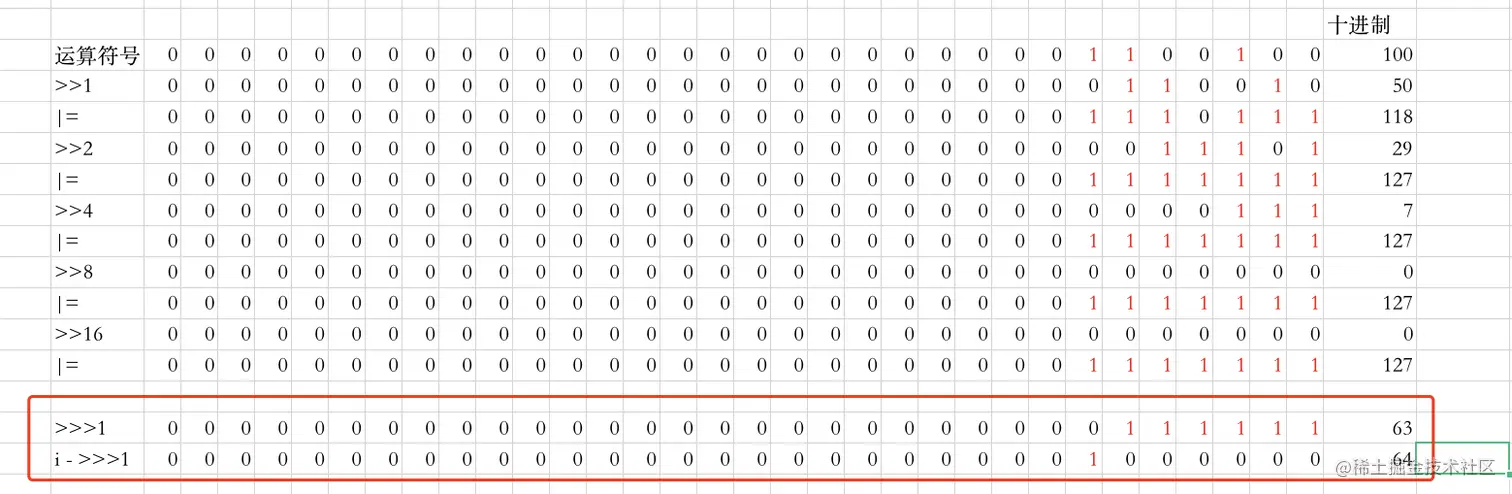 这里的场景当中,我们其实不会用到负数,所以这里的>>和>>>可以看做是等价(这两者的区别应该不用再说了吧),OK,我们举例i=100,由于是位运算,所以我这边将100用二进制进行表示: