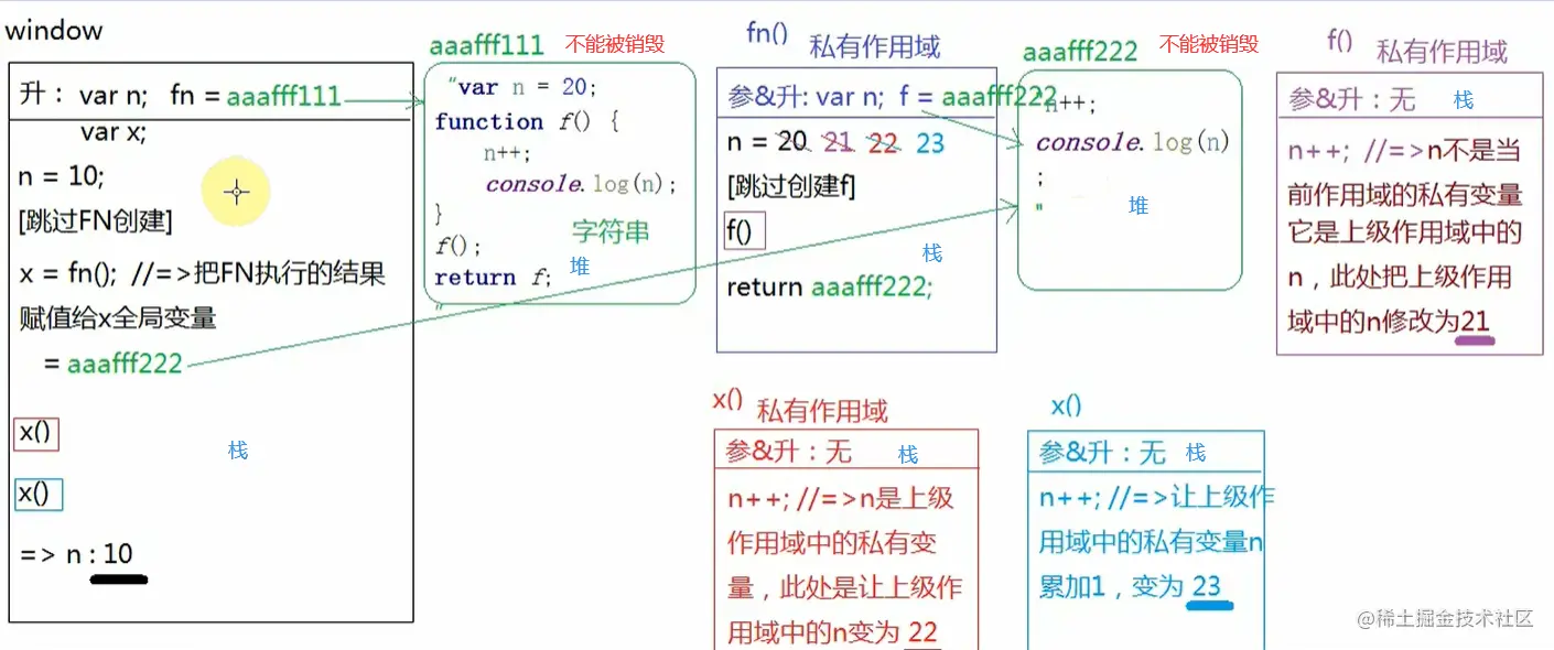 比如fn形成的栈内存销毁不了,因为aaafff222是在它里面开辟的堆,这个堆没有销毁,所以这个栈也不能销毁!!