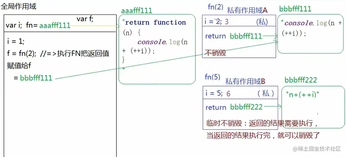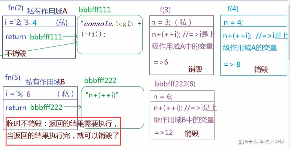 在这里虽然fn执行的返回结果没有赋给f,没有被外部变量占用,但是它的结果(小函数)还是要执行,所以要开辟堆,暂时占用fn私有作用域,等小函数执行完了就可以一块销毁(堆和栈)。