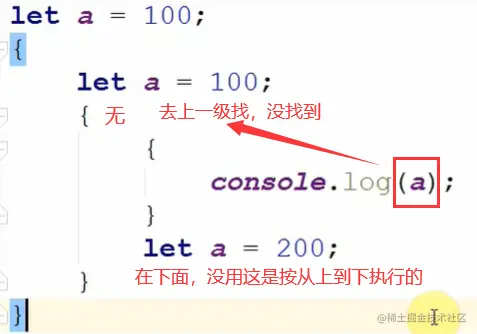 为什么报错呢?因为a是上面的块级作用域私有的,我们用不了它