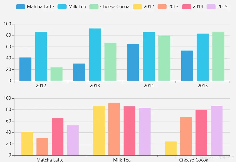 mytextStyle={ color:"#333", //文字颜色 fontStyle:"normal", //italic斜体 oblique倾斜 fontWeight:"normal", //文字粗细bold bolder lighter 100 | 200 | 300 | 400... fontFamily:"sans-serif", //字体系列 fontSize:18, //字体大小 }; mylineStyle={ color:"#333", //颜色,'rgb(128, 128, 128)','rgba(128, 128, 128, 0.5)',支持线性渐变,径向渐变,纹理填充 shadowColor:"red", //阴影颜色 shadowOffsetX:0, //阴影水平方向上的偏移距离。 shadowOffsetY:0, //阴影垂直方向上的偏移距离 shadowBlur:10, //图形阴影的模糊大小。 type:"solid", //坐标轴线线的类型,solid,dashed,dotted width:1, //坐标轴线线宽 opacity:1, //图形透明度。支持从 0 到 1 的数字,为 0 时不绘制该图形 }; myareaStyle={ color:['rgba(250,250,250,0.3)','rgba(200,200,200,0.3)'],//分隔区域颜色。分隔区域会按数组中颜色的顺序依次循环设置颜色。默认是一个深浅的间隔色。 shadowColor:"red", //阴影颜色 shadowOffsetX:0, //阴影水平方向上的偏移距离。 shadowOffsetY:0, //阴影垂直方向上的偏移距离 shadowBlur:10, //图形阴影的模糊大小。 opacity:1, //图形透明度。支持从 0 到 1 的数字,为 0 时不绘制该图形 }; myitemStyle={ color:"red", //颜色 borderColor:"#000", //边框颜色 borderWidth:0, //柱条的描边宽度,默认不描边。 borderType:"solid", //柱条的描边类型,默认为实线,支持 'dashed', 'dotted'。 barBorderRadius:0, //柱形边框圆角半径,单位px,支持传入数组分别指定柱形4个圆角半径。 shadowBlur:10, //图形阴影的模糊大小。 shadowColor:"#000", //阴影颜色 shadowOffsetX:0, //阴影水平方向上的偏移距离。 shadowOffsetY:0, //阴影垂直方向上的偏移距离。 opacity:1, //图形透明度。支持从 0 到 1 的数字,为 0 时不绘制该图形。 }; mylabel={ show:false, //是否显示标签。 position:"inside", //标签的位置。// 绝对的像素值[10, 10],// 相对的百分比['50%', '50%'].'top','left','right','bottom','inside','insideLeft','insideRight','insideTop','insideBottom','insideTopLeft','insideBottomLeft','insideTopRight','insideBottomRight' offset:[30, 40], //是否对文字进行偏移。默认不偏移。例如:[30, 40] 表示文字在横向上偏移 30,纵向上偏移 40。 formatter:'{b}: {c}', //标签内容格式器。模板变量有 {a}、{b}、{c},分别表示系列名,数据名,数据值。 textStyle:mytextStyle }; mypoint={ symbol:"pin", //图形 'circle', 'rect', 'roundRect', 'triangle', 'diamond', 'pin', 'arrow' symbolSize:50, //标记的大小,可以设置成诸如 10 这样单一的数字,也可以用数组分开表示宽和高,例如 [20, 10] 表示标记宽为20,高为10。 symbolRotate:0, //标记的旋转角度。注意在 markLine 中当 symbol 为 'arrow' 时会忽略 symbolRotate 强制设置为切线的角度。 symbolOffset:[0,0], //标记相对于原本位置的偏移。默认情况下,标记会居中置放在数据对应的位置 silent:false, //图形是否不响应和触发鼠标事件,默认为 false,即响应和触发鼠标事件。 label:{ normal:mylabel, emphasis:mylabel }, itemStyle:{ normal:myitemStyle, emphasis:myitemStyle } }; myline={ symbol:["pin","circle"], //图形 'circle', 'rect', 'roundRect', 'triangle', 'diamond', 'pin', 'arrow' symbolSize:50, //标记的大小,可以设置成诸如 10 这样单一的数字,也可以用数组分开表示宽和高,例如 [20, 10] 表示标记宽为20,高为10。 precision:2, //标线数值的精度,在显示平均值线的时候有用。 silent:false, //图形是否不响应和触发鼠标事件,默认为 false,即响应和触发鼠标事件。 label:{ normal:mylabel, emphasis:mylabel }, lineStyle:{ normal:mylineStyle, emphasis:mylineStyle } }; myarea={ silent:false, //图形是否不响应和触发鼠标事件,默认为 false,即响应和触发鼠标事件。 label:{ normal:mylabel, emphasis:mylabel }, itemStyle:{ normal:myitemStyle, emphasis:myitemStyle } }; series=[ { type:"bar", //柱形 zlevel:0, //柱状图所有图形的 zlevel 值。 z:2, //柱状图组件的所有图形的z值。控制图形的前后顺序。z值小的图形会被z值大的图形覆盖。 silent:false, //图形是否不响应和触发鼠标事件,默认为 false,即响应和触发鼠标事件。 name:"数据名称", //系列名称,用于tooltip的显示,legend 的图例筛选,在 setOption 更新数据和配置项时用于指定对应的系列。 legendHoverLink:true, //是否启用图例 hover 时的联动高亮。 coordinateSystem:"cartesian2d",////'cartesian2d'使用二维的直角坐标系。'geo'使用地理坐标系 xAxisIndex:0, //使用的 x 轴的 index,在单个图表实例中存在多个 x 轴的时候有用。 yAxisIndex:0, //使用的 y 轴的 index,在单个图表实例中存在多个 y轴的时候有用。 label:{ //图形上的文本标签,可用于说明图形的一些数据信息,比如值,名称等, normal:mylabel, emphasis:mylabel }, itemStyle:{ //图形样式,normal 是图形在默认状态下的样式;emphasis 是图形在高亮状态下的样式,比如在鼠标悬浮或者图例联动高亮时。 normal:myitemStyle, emphasis:myitemStyle, }, stack:null, //数据堆叠,同个类目轴上系列配置相同的stack值可以堆叠放置。 cursor:"pointer", //鼠标悬浮时在图形元素上时鼠标的样式是什么。同 CSS 的 cursor。 barGap:"30%", //柱间距离,可设固定值(如 20)或者百分比(如 '30%',表示柱子宽度的 30%)。 barCategoryGap:"20%", //类目间柱形距离,默认为类目间距的20%,可设固定值 encode: { //可以定义 data 的哪个维度被编码成什么 x: [3, 1, 5], // 表示维度 3、1、5 映射到 x 轴。 y: 2, // 表示维度 2 映射到 y 轴。 tooltip: [3, 2, 4], // 表示维度 3、2、4 会在 tooltip 中显示。 label: 3 // 表示 label 使用维度 3。 }, data: [ //每一列称为一个『维度』。维度下标从0开始 [12, 44, 55, 66, 2], [23, 6, 16, 23, 1