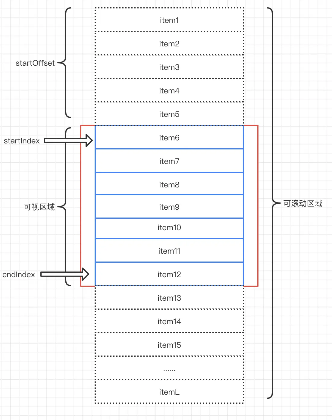 - 列表的区域在红框内滚动(可视区域)