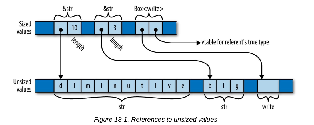 在Rust中一个类型实现了Size trait 则表明该类型在编译时能确定大小。Rust的基本类型基本都实现了Size trait。如果一个类型没有实现该trait,则不能用于定义变量和作为参数传递。那在Rust中哪些类型没有实现Size trait 呢?str, [T], trait 都没有实现该trait。通过引用和trait object 可以包装成有大小的类型。看一张图: