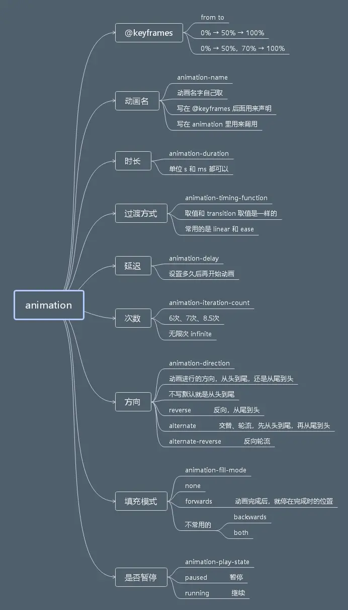 animation:动画名 时长 过渡方式 延迟 动画次数 动画方向 填充模式 是否暂停;