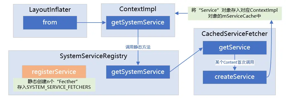 这下明白了:静态代码块创建了多个“Service”,与此同时静态的sServiceCacheSize记录了“Service”的数量,CachedServiceFetcher记录了“Service”的下标,在每个ContextImpl被创建的时候,非静态的mServiceCache就根据sServiceCacheSize进行初始化,在我们调用Context#getSystemService的时候,如果当前Context的mServiceCache没有对应的“Service”,就创建一个,放到CachedServiceFetcher事先记录好的下标下。