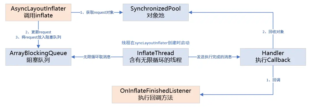 take获取到元素,异步线程开始执行View的创建,并在执行完成后发送消息给Handler。 Handler回调主线程,执行OnInflateFinishedListener回调对象,然后回收InflateRequest对象。
