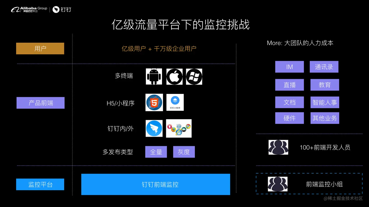 对于这样一个亿级平台,除了做前端监控系统之外,我相信很多小伙伴也有体感,要保证整体钉钉前端的稳定性,还需要有一些技术运营的手段,包括人的一些情况。我们现在整体有 100 多个前端开发成员,然后我们的技术模块上面有 IM、通讯录、直播、教育、文档、硬件等等非常具有 B 端属性的业务。