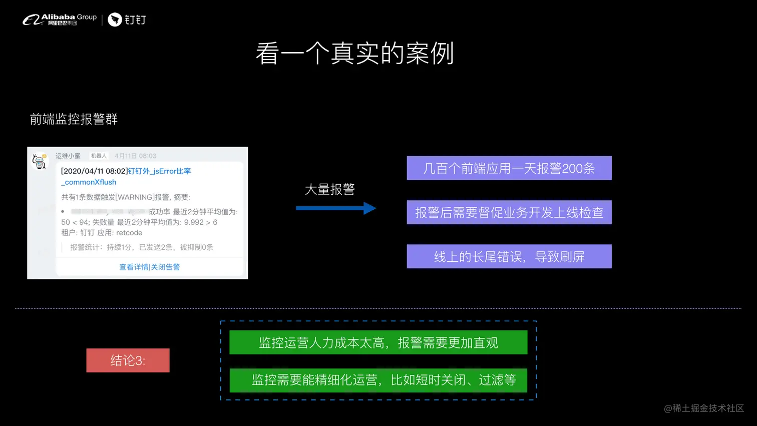 所以结论 3 就是我们监控运营的人力成本非常高,对于前端监控的要求不仅仅是要报警报出来,还需要你的报警是直观的、实时的,同时要支持一些短时关闭和错误过滤等等手段。