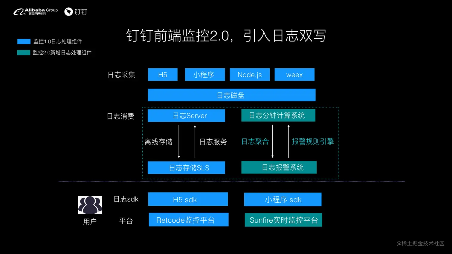 在上图的紫色虚线下方,是我们的用户视角。用户侧触碰到的是两块,第 1 块是前端监控 SDK,我们有 H5 和小程序的 SDK,第二块是平台,包括分析平台和报警平台。