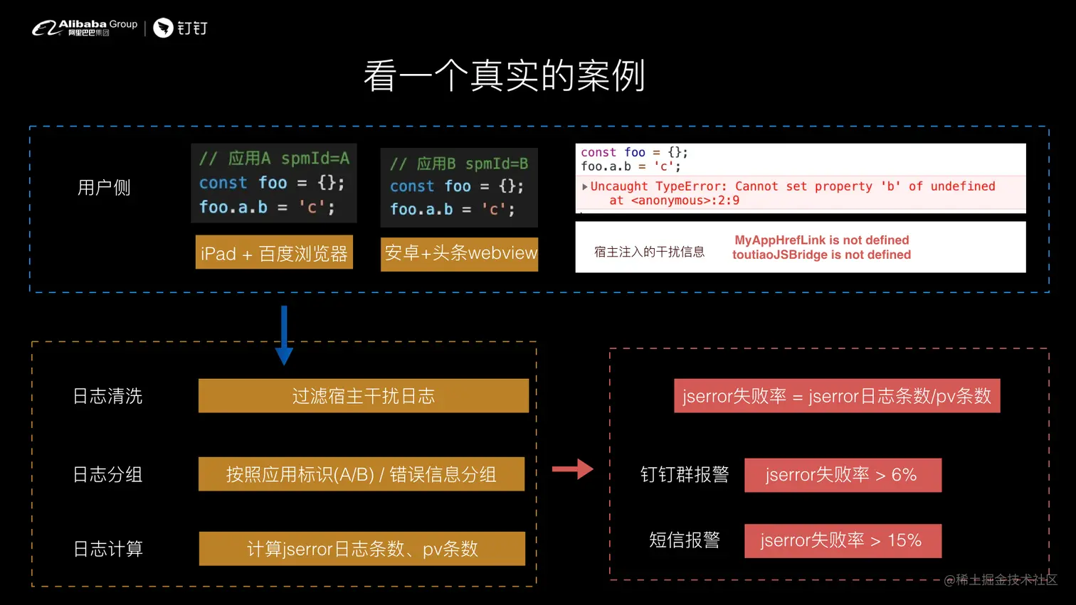 举个例子,如上是我们线上的一个应用,大概 js error 率是 0.08%, 对于钉钉这样的体量来说,这个错误率影响用户的数量已经非常大了。