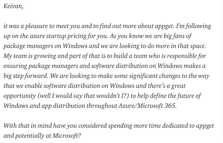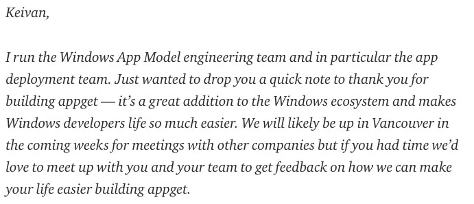大会前一开,作者突然收到邮件,邮件中表示微软也在开发一个与AppGet功能相同的软件包管理器,并希望作者给出建议。