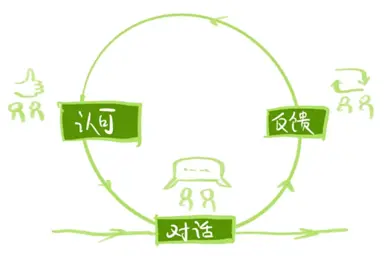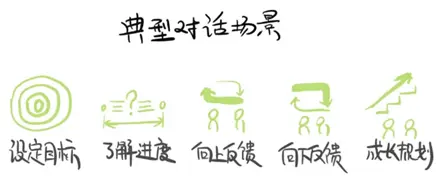 1) 对话(Conversation)主要指领导和员工之间的一对一沟通,可以是面对面的,也可以是电话,视频等其他方式。这个对话要高频进行,除了在前面讲的OKR季度目标确定,OKR季度复盘时发生,更应该随时发生。
