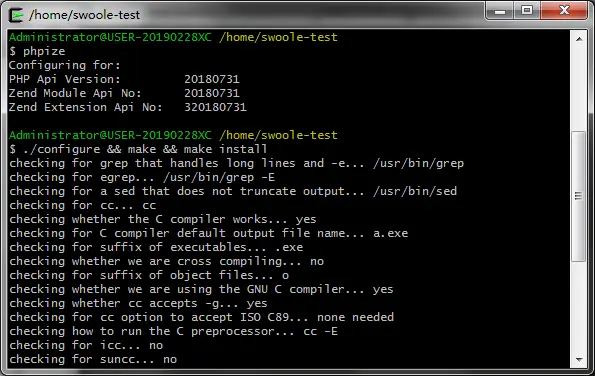 上面生成编译的配置文件后,再输入命令./configure && make && make install,然后就是等待编译安装Swoole完成