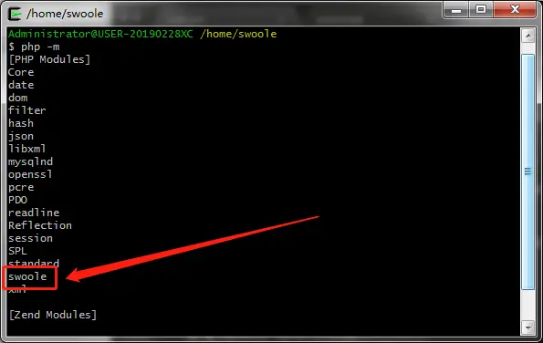 然后我们再通过命令php -m查看一下是否真的有这个扩展了呢,从下图可以发现,确实已经有了swoole的扩展