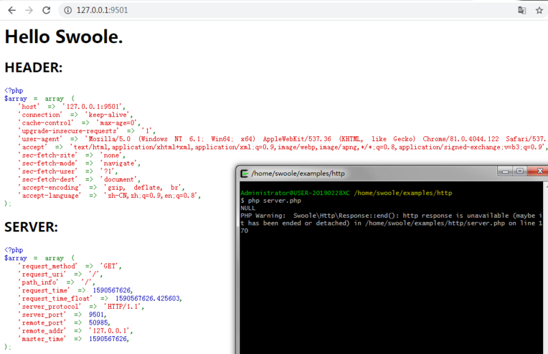 我们打开server.php文件,有一行代码$http = new swoole_http_server("0.0.0.0", 9501);,开启swoole服务的端口为9501,那么我们可以直接在浏览器地址栏输入127.0.0.1:9501或者localhost:9501并访问,显示Hello Swoole.,则说明Swoole安装成功了!