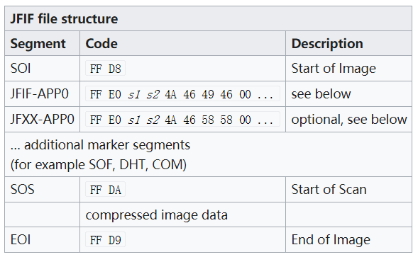 - JPEG jpeg格式是也是分段存储相关信息,头信息的segment key是SOI,码值固定是十六进制的FF,D8,而且下一个segment是以FF开头的。所以代码里面的定义是: