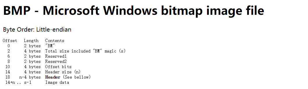 - BMP 格式信息在头部最开始的两个字节,用来存放BM字符: