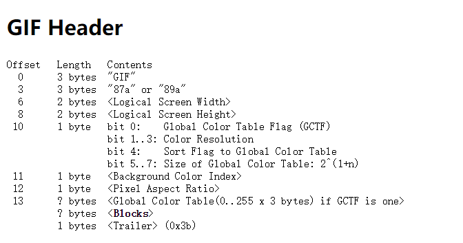 - GIF 格式信息主要在开始六个字节,直接上图: