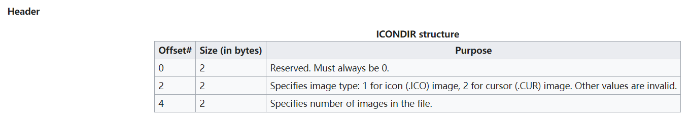 - ICO 格式信息藏在头部的六个字节中,相关定义如下: