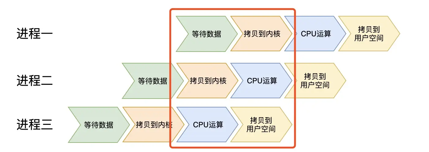 没错,从操作系统层看程序运行时的数据流的话,是有 「等待数据 --- 数据拷贝到内核空间 --- cpu运算 --- 数据从内核空间拷贝到用户空间」 这几个过程的