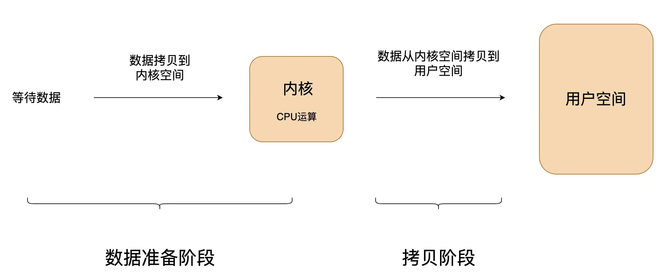 其中,「等待数据 --- 数据拷贝到内核空间 --- cpu运算」叫做 数据准备阶段,「数据从内核空间拷贝到用户空间」叫做 数据拷贝阶段