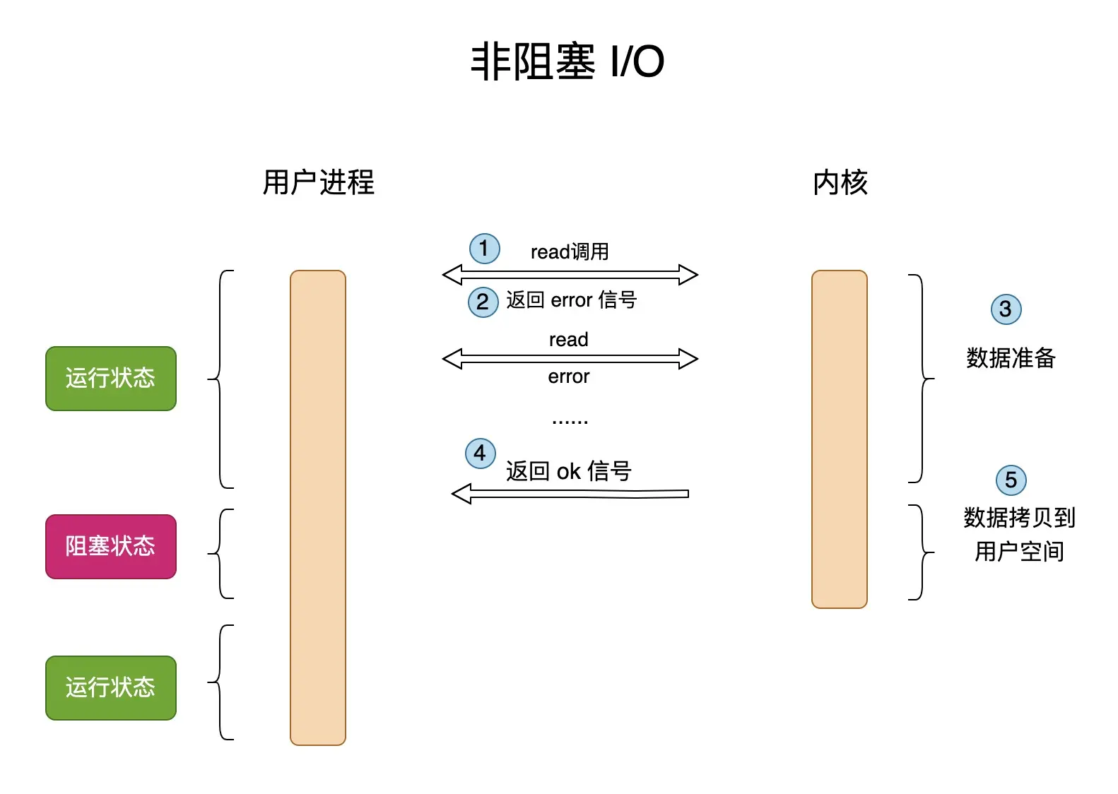 和「阻塞 I/O」不同的是。「非阻塞 I/O」的进程发起一个read调用时,如果内核的数据还没有准备好,它就会立刻返回一个error信号。