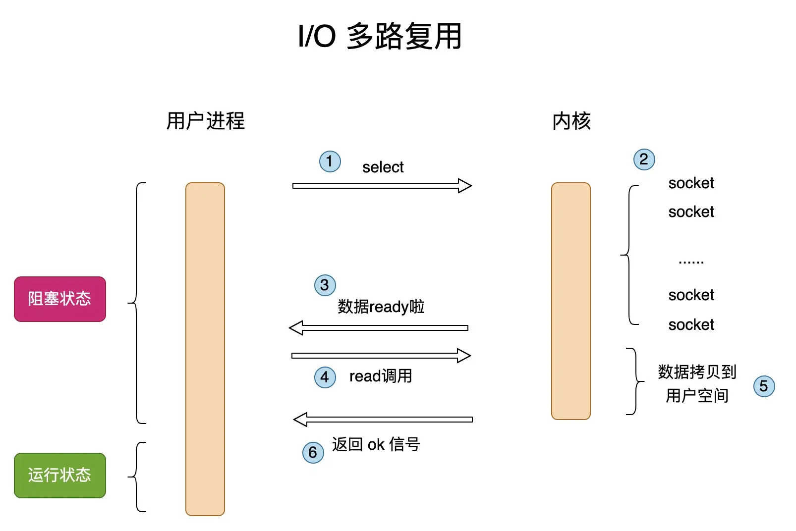 这种阻塞包括两个阶段,一个是发起select方法等待socket返回数据时阻塞,另一个是等待数据从内核控件拷贝到用户空间时阻塞,从这就可以看出和「阻塞 I/O」其实是一样的
