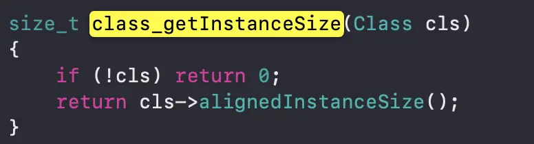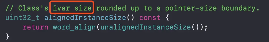 通过查看class_getInstanceSize的实现我们可以看出,alignedInstanceSize() 函数的作用是获取类中的ivar size成员变量的大小