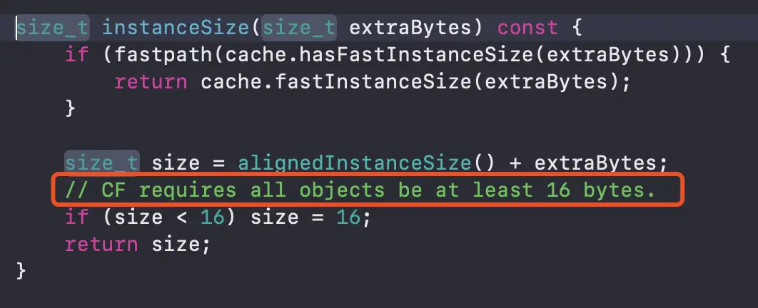 通过上图可以看出,源码注释为所有的对象必须至少占用16个字节的内存空间,如果没有达到16个字节,会强制分配16个字节的内存空间给这个对象